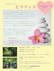 しなやかBodyメイク ピラティス 期間:2017年02月15日 レッスンスケジュール毎週水曜日(月3回) 10:00~11:002月の予定:1日、8日、15日 会 場:3F パフォーマンス工房2 レッスン料:初回体験 500円 1回1,500円または4回チケット5,500円 少人数制 持ち物:水、タオル(ストレッチ用)、ヨガマット※ヨガマットの無料レンタルもございます。 事前にお問合せください。 予約・問合せ:naia_raks@yahoo.com スケジュール:NaiaAmwaj.com