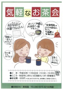 気軽なお茶会 期間:2018年11月04日 開催日:11月4日(日) 時 間:10:30~15:00 ※時間内であれば何時に入場してもOKです。 会 場:4F 研修室3 参加費:500円 はじめての方でも、お気軽にご参加ください。 問合せ:実践塾 TEL 090-9375-9218(斉藤)