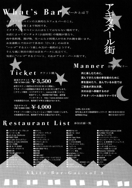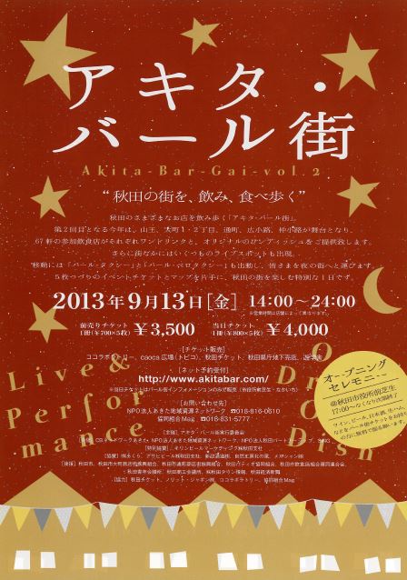 アキタ・バール街 期間:2013年09月13日 開催日:9月13日(金) 時 間:14:00~24:00 会 場:エリアなかいち、大町、山王など 問合せ:NPO法人あきた地域資源ネットワーク 018-816-0610 協同組合Mag 018-831-5777