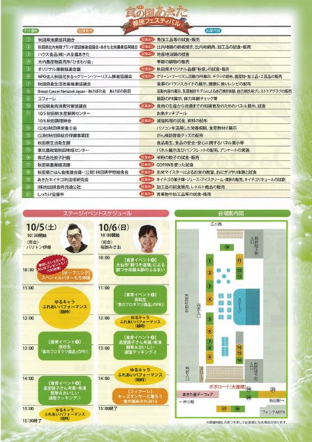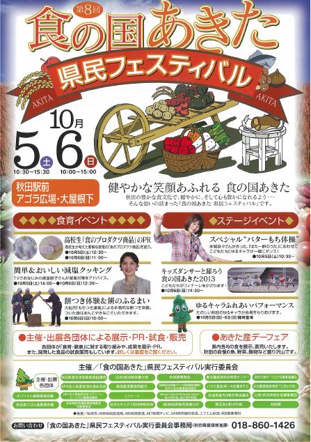 「食の国あきた」県民フェスティバル 期間:2013年10月05日 ~ 2013年10月06日 開催日:10月5日(土)、6日(日) 時 間:5日 10:30~15:30 6日 10:00~15:00 会 場:アゴラ広場・大屋根下 問合せ:食の国あきた県民フェスティバル実行委員会事務局 ☎018-860-1426