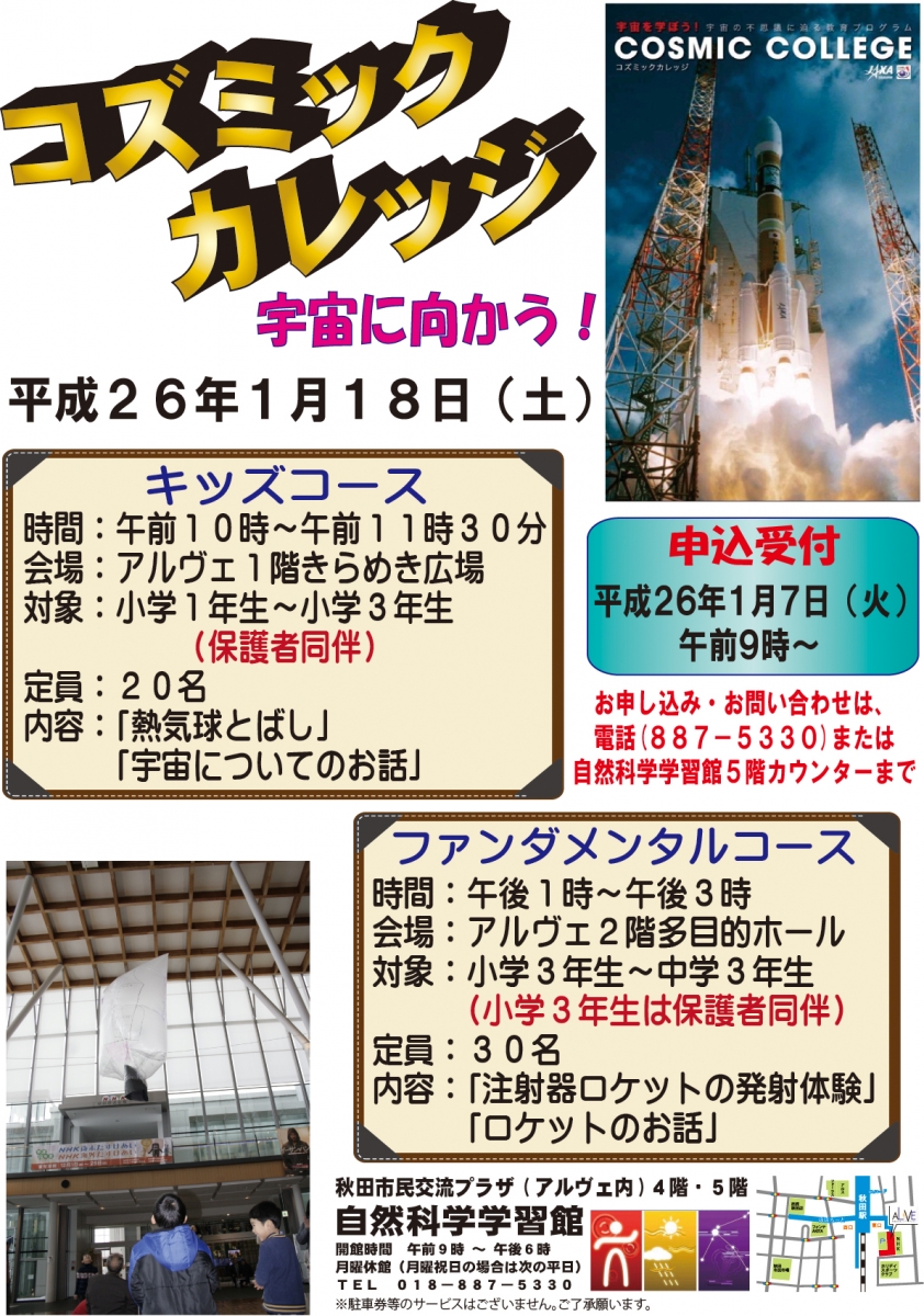コズミックカレッジ「宇宙へ向かう!」 期間:2014年01月18日 開催日:1月18日(土) 時 間:10:00~11:30 会 場:アルヴェ きらめき広場 定 員:20名 対 象:小学1年生~小学3年生(保護者同伴)