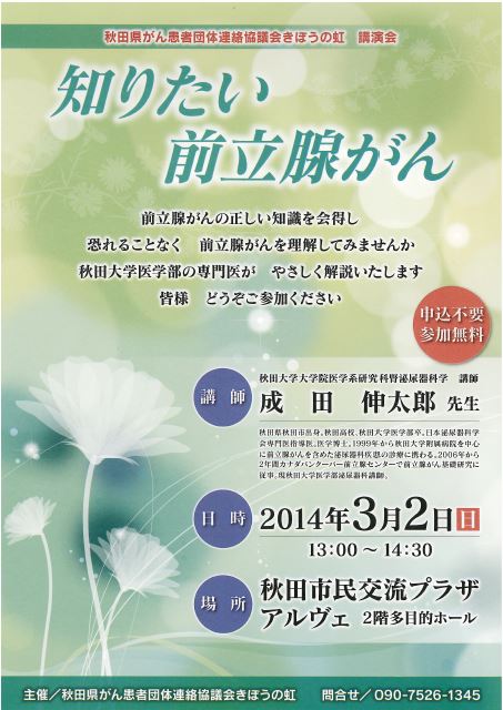 知りたい前立腺がん 期間:2014年03月02日 開催日:3月2日(日) 時 間:13:00~14:30 会 場:アルヴェ 2階多目的ホール 入場料:無料(申込不要) 問合せ:秋田県がん患者団体連絡協議会きぼうの虹 090-7526-1345