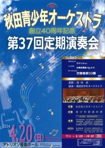 秋田青少年オーケストラ 創立40周年記念 第37回定期演奏会 期間:2014年04月20日 開催日:4月20日(日) 時 間:14:30~ 会 場:アトリオン 音楽ホール 入場料:一般1,000円 小中高800円(全席自由) 問合せ:☎018-835-6355