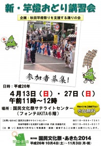 新・竿燈おどり講習会 期間:2014年04月27日 開催日:4月27日(日) 時 間:11:00~12:00 会 場:フォンテAKITA 国文祭サテライトセンター 参加費:無料(手ぬぐいをご持参ください) 問合せ:018-884-7341