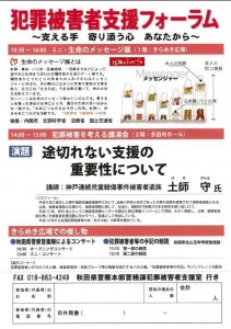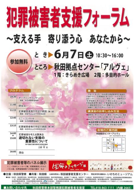 犯罪被害者支援フォーラム 期間:2014年06月07日 開催日:6月7日(土) 時 間:10:30~16:00 会 場:アルヴェ きらめき広場・多目的ホール 問合せ:秋田県警察本部警務課犯罪被害者支援室 ☎018-863-1111
