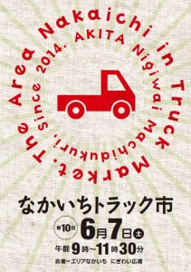 【第10回】なかいちトラック市 期間:2014年06月07日 開催日:5月31日(土) 時 間:9:00〜11:30 会 場:エリアなかいち/にぎわい広場 参加申込・お問合せ:トラック市プロジェクト事務局 担当/森川・瀧田・船川・舟山 TEL:018-836-3900 FAX:018-836-3901 ツイッターアカウント:https://twitter.com/naka1_truck1 主 催:あきたまちづくり共同企業体