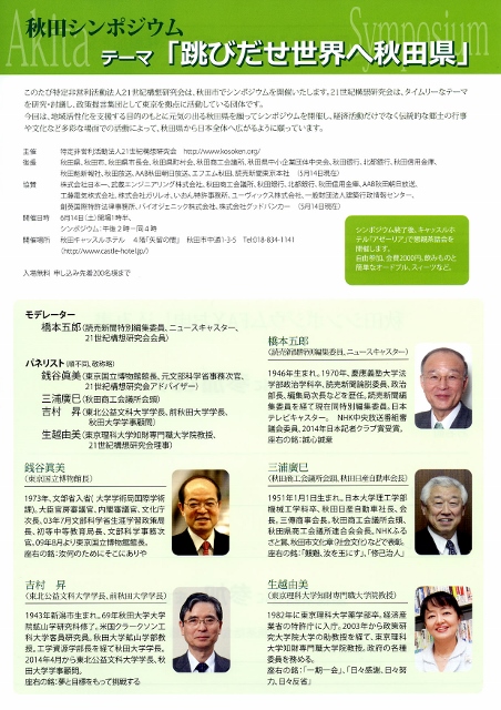 21世紀構想研究会主催「秋田シンポジウム」 期間:2014年06月14日 開催日:6月14日(土) 時 間:14:00~16:00 会 場:秋田キャッスルホテル 4階「矢留の間」 問合せ:☎018-834-1141