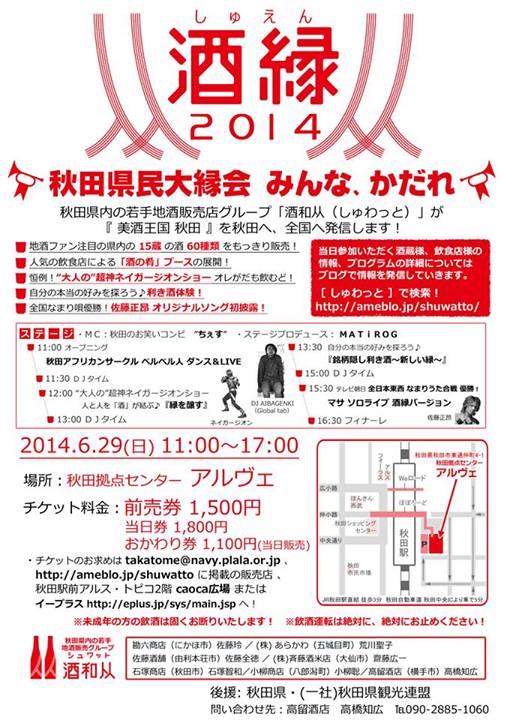 酒縁2014 期間:2014年06月29日 開催日:6月29日(日) 時 間:11:00~17:00 会 場:アルヴェ きらめき広場 料 金:前売券1,500円 当日券1,800円 おかわり券1,100円(当日販売) 問合せ:高留商店 090-2885-1060