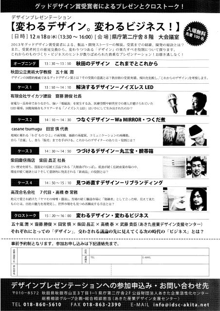 【GOOD DESIGN AWARD 2013】~展示ホール 期間:2013年11月29日 ~ 2013年12月01日 会 期:11月29日(金)~12月1日(日) 10:00~18:00 最終日のみ17:30 会 場:2階 展示ホール 入場料:無料 問合せ:公益財団法人あきた企業活性化センター ☎018-860-5610