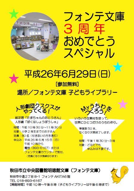 フォンテ文庫3周年おめでとうスペシャル「人形劇団クスクス」上演会 期間:2014年06月29日 開催日:6月29日(日) 時 間:10:30~11:30 会 場:フォンテAKITA フォンテ文庫 対 象:小学2年生までのお子さん 定 員:80名 申込み:6月15日(日) 午前10時から 電話(018-893-6167)またはフォンテ文庫カウンターにて受付