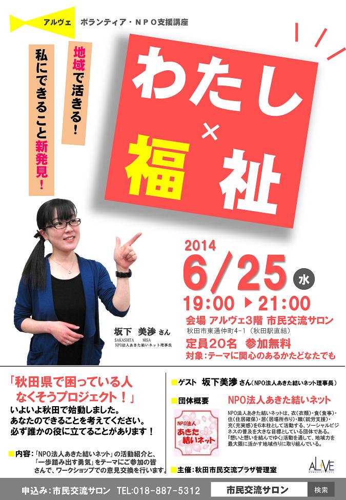 ボランティア・NPO支援講座「わたし×福祉」 期間:2014年06月25日 開催日:6月25日(水) 時 間:19:00~21:00 会 場:アルヴェ 市民交流プラザ 参加料:無料 定 員:20名 申込み:市民交流サロン ☎018-887-5312