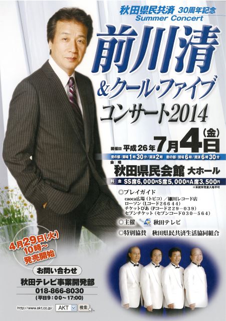 前川清&クールファイブコンサート 期間:2014年07月04日 開催日:7月4日(金) 時 間:昼の部14:00(開場13:30) 夜の部18:30(開場18:00) 会 場:秋田県民会館 大ホール 料 金:SS席6,000円 S席5,000円 A席3,500円 問合せ:秋田テレビ事業部 ☎018-866-8030(平日9:00~17:00)