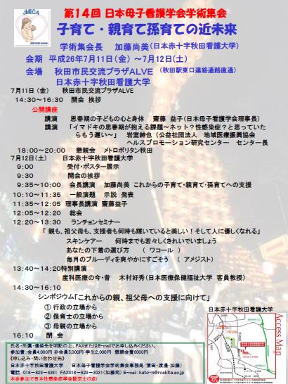 第14回日本母子看護学会学術集会 公開講座 期間:2014年07月11日 開催日:7月11日(金) 時 間:14:00~16:30 会 場:アルヴェ 多目的ホール 問合せ:日本赤十字秋田看護大学 ☎018-829-4361