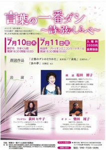 言葉の一番ダシ~詩と弦のしらべ~ 期間:2014年07月11日 開催日:7月11日(金) 時 間:18:30~(開場18:00) 会 場:アトリオン ミニコンサートホール 入場料:2,000円(全席自由) 問合せ:塩田090-7326-4696