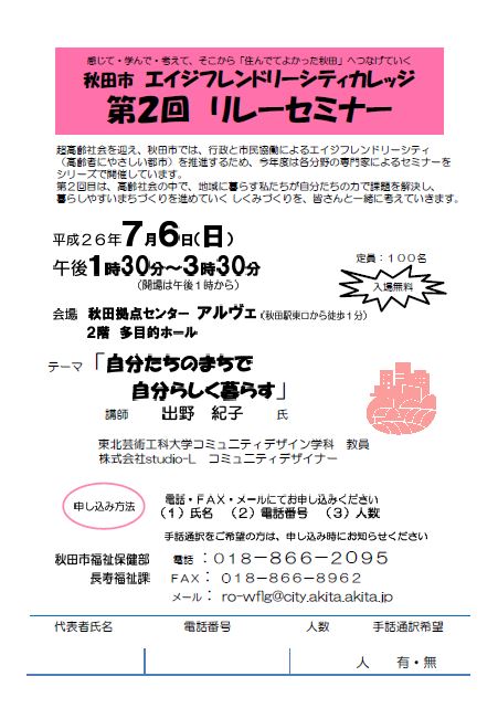 エイジフレンドリーシティカレッジ第2回リレーセミナー 期間:2014年07月06日 開催日:7月6日(日) 時 間:13:30~15:30 会 場:アルヴェ 多目的ホール 問合せ:秋田市福祉保健部 長寿福祉課 ☎018-866-2095