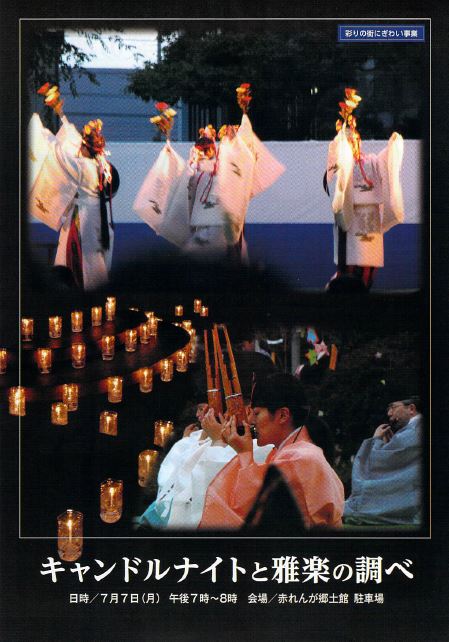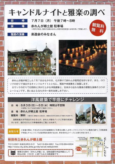 彩りの街賑わい事業「キャンドルナイトと雅楽の調べ」 期間:2014年07月07日 開催日:7月7日(月) 時 間:19:00~20:00 会 場:赤れんが郷土館駐車場 観覧料:無料 問合せ:赤れんが郷土館 ☎018-864-6854