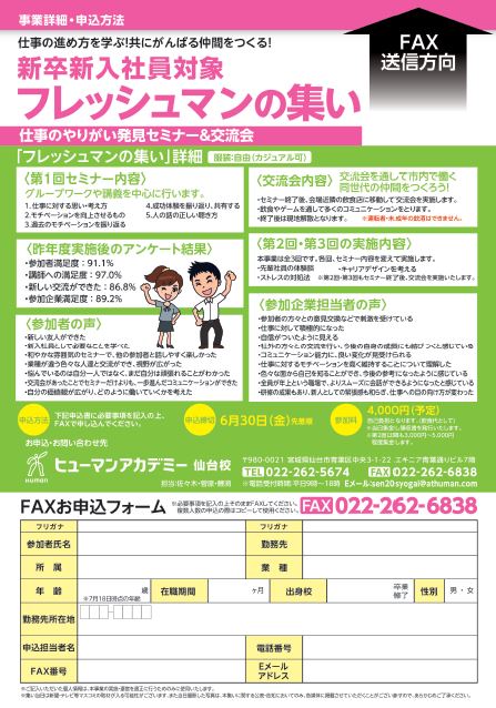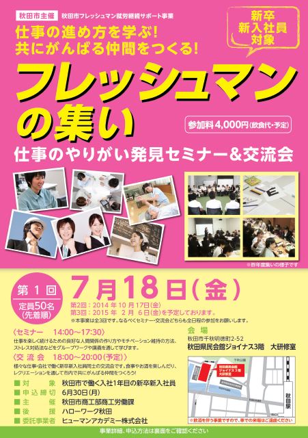 フレッシュマンの集い 期間:2014年07月18日 開催日:7月18日(金) 時 間:14:00~20:00 会 場:秋田県民会館 ジョイナス 参加料:4,000円 定 員:先着50名 問合せ:ヒューマンアカデミー仙台校 ☎022-262-5674