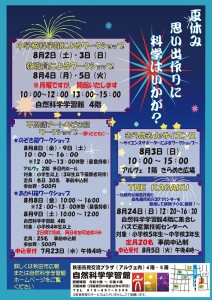 中学校科学部によるワークショップ 期間:2014年08月02日 ~ 2014年08月03日 開催日:8月2日(土)、3日(日) 時 間:1回目10:00~12:00 2回目13:00~15:00 会 場:アルヴェ 自然科学学習館 問合せ:☎018-887-5330