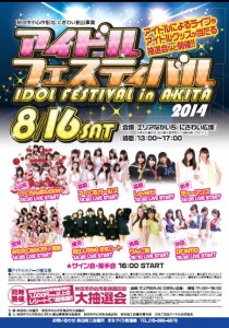 アイドルフェスティバルinAKITA2014 期間:2014年08月16日 開催日:8月16日(土) 時 間:13:00~17:00 会 場:にぎわい広場(雨天時はジョイナス) 入場料:無料 出 演:pramo(秋田) りんご娘(青森) チャーマンズ(岩手) さくらんぼんBom(山形) みちのく仙台ORI☆姫隊(宮城) アイくるガールズ(福島) Loveit!(福島) BELLRING少女ハート(東京) 問合せ:秋田商工会議所 まちづくり推進課 ☎018-866-6676