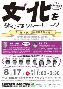 文化を旅するリレートーク「再び、民俗芸能を旅する」 期間:2014年08月17日 今回のテーマは「民俗芸能」。秋田市無形民俗文化財に指定されている「山谷番楽」を、小中学生の実演を交えながら、民俗芸能の伝承について語ります。 地域に伝わる伝統を守る子どもたちにご注目ください。 開催日:8月17日(日) 時 間:13:00~14:00 会 場:フォンテAKITA 国文祭サテライトセンター 出 演:秋田市山谷番楽保存会 丸谷仁美 問合せ:国民文化祭サテライトセンター ☎018-884-7341