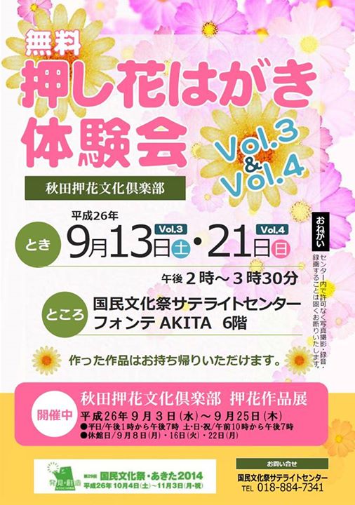 押し花はがき体験会vol3 期間:2014年09月13日 開催日:9月13日(土) 時 間:14:00~15:30 会 場:フォンテAKITA 国文祭サテライトセンター 問合せ:018-884-7341