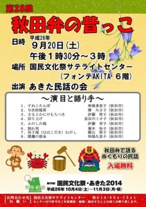 第28回秋田弁の昔っこ 期間:2014年09月20日 開催日:9月20日(土) 時 間:13:30~15:00 会 場:フォンテAKITA 国文祭サテライトセンター 入場料:無料 出 演:あきた民話の会