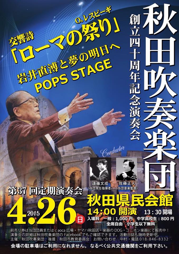秋田吹奏楽団第37回定期演奏会 期間:2015年04月26日 開催日:4月26日(日) 時 間:14:00~16:30 会 場:秋田県民会館 料 金:一般1,000円 中学高校生800円 全席自由 小学生以下無料 問合せ:☎018-846-8332(中村)