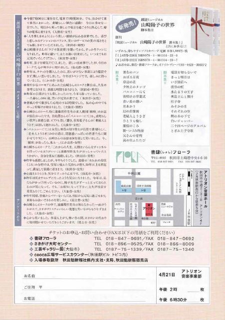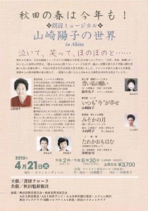 朗読ミュージカル 山崎陽子の世界in Akita 期間:2015年04月21日 開催日:4月21日(火) 時 間:①開演 14:00(開場 13:00) ②開演18:30(開場17:30) 会 場:アトリオン 音楽ホール 入場料:3,700円(全席自由)