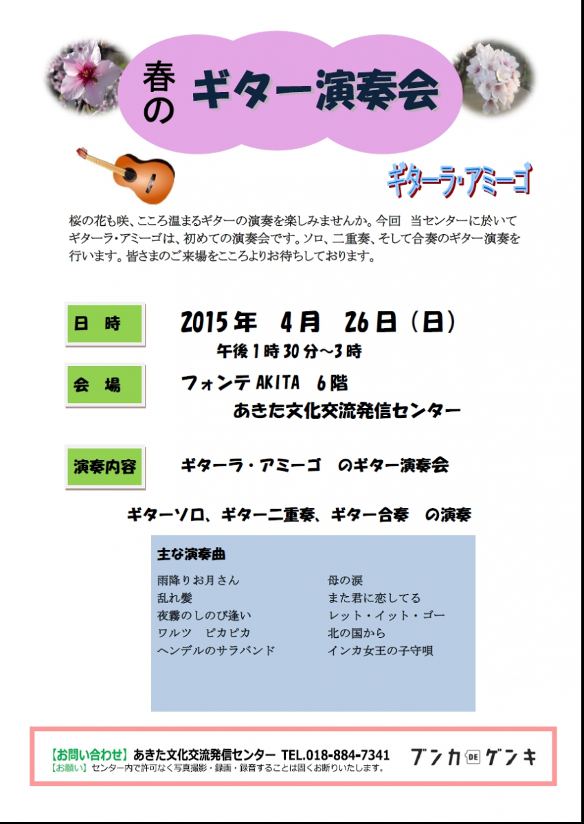 ギターラ・アミーゴ 春のギター演奏会 期間:2015年04月26日 開催日:4月26日(日) 時 間:13:30~15:00 会 場:フォンテAKITA あきた文化交流発信センター 問合せ:☎018-884-7341