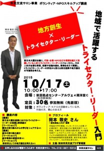 地方創生×トライセクターリーダー~地域で活躍するトライセクター・リーダー入門~ 期間:2015年10月17日 開催日:10月17日(土) 時 間:10:00~17:00 会 場:アルヴェ4階 洋室C 定 員:30名(先着順) 参加費:無料 対 象:ボランティア・NPOの活動をしている方、行政の方、関心のある方 申込み:氏名・電話番号を添えて、アルヴェ3階市民交流サロンまでお願いいたします。 ☎018-887-5312 主 催:秋田市民交流プラザ管理室