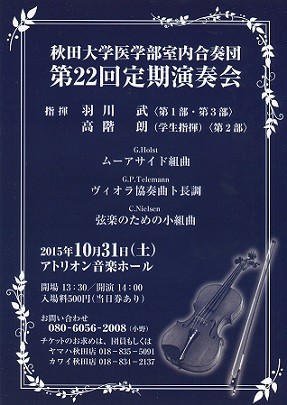 秋田大学医学部室内合奏団第22回定期演奏会 期間:2015年10月31日 開催日:10月31日(土) 時 間:14:00~(13:30開場) 会 場:アトリオン 音楽ホール 入場料:500円 問合せ:☎080-6056-2008