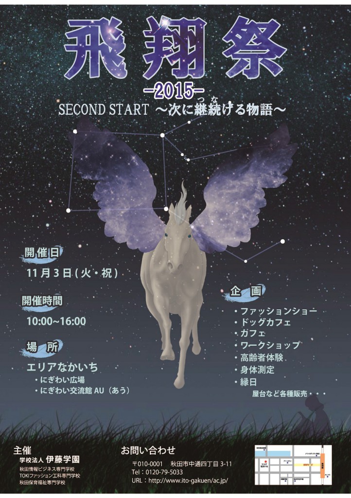 飛翔祭-2015-SECOND START〜次に継続げる物語〜 期間:2015年11月03日 ●開催日:11月3日(火・祝)●時 間:10:00~16:00●会 場:秋田市にぎわい交流館、にぎわい広場●内 容:ファッションショー ドッグカフェ カフェ ワークショップ 高齢者体験 身体測定 縁日 ・・・ほか屋台など各種販売●問合せ:☎︎0120-79-5033