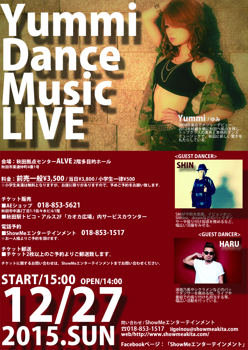 Yummiワンマンライブ 期間:2015年12月27日 開催日:12月27日(日) 時 間:15:00~(14:00開場) 会 場:アルヴェ 多目的ホール 料 金:前売/3,500円 当日/3,800円 小学生/一律500円 ※小学生未満は無料(保護者同伴必須)。 事前予約が必要となります。 問合せ:ShowMeエンターテインメント ☎018-853-1517