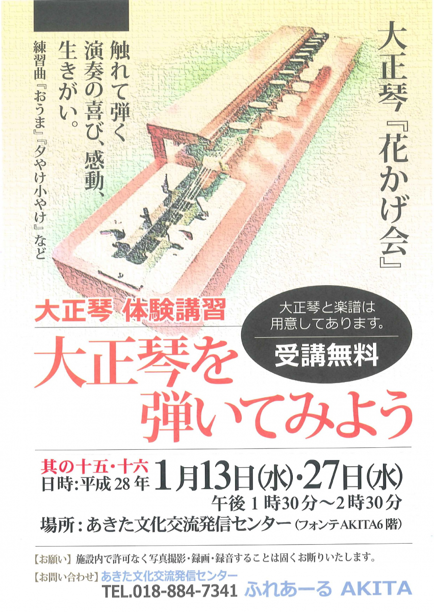 大正琴を弾いてみよう 其の十五 期間:2016年01月13日 開催日:1月13日(水) 時 間:13:30~14:30 会 場:フォンテAKITA あきた文化交流発信センター 問合せ:☎︎018-884-7341