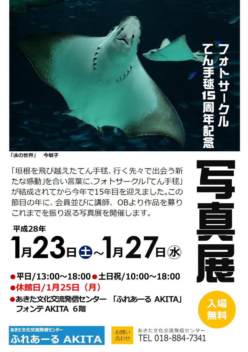 フォトサークルてん手毬 15周年記念写真展 期間:2016年01月23日 ~ 2016年01月27日 会 期:1月23日(土)~27日(水)※25日休館日 時 間:平日/13:00~18:00 土日祝/10:00~18:00 会 場:フォンテAKITA あきた文化交流発信センター 問合せ:☎︎018-884-7341