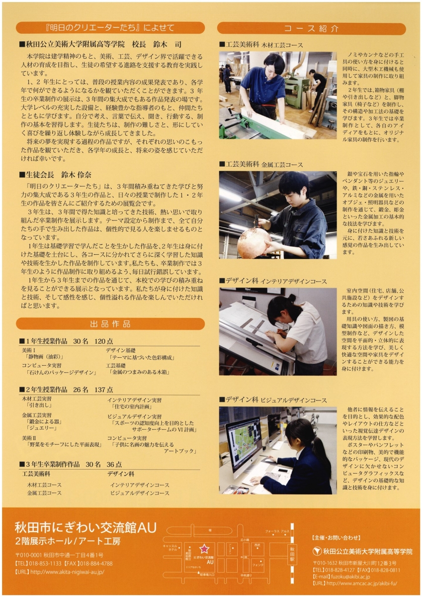 平成27年度秋田公立美術大学附属高等学院 「第63回生徒作品展」 期間:2016年02月10日 ~ 2016年02月14日 開催日:2月10日(水)~14日(日) 時 間:9:00~18:00 ※最終日は17:00まで 会 場:2F 展示ホール/アート工房 入 場:無料 主 催:秋田公立美術大学附属高等学院 〒010-1632 秋田市新屋大川町12番3号 TEL 018-828-4127/FAX 018-828-0811