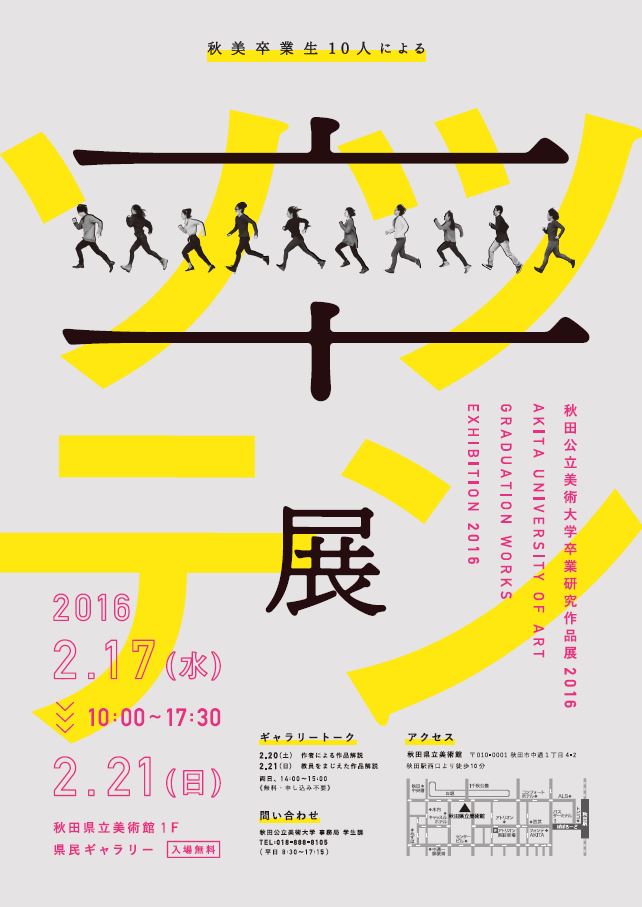 秋田公立美術大学 卒業研究作品展2016 期間:2016年02月17日 ~ 2016年02月21日 会 期:2月17日(水)~21日(日) 時 間:10:00~17:30 会 場:秋田県立美術館 1F県民ギャラリー 入場料:無料 問合せ:☎018-888-8105 秋田公立美術大学 事務局 学生課