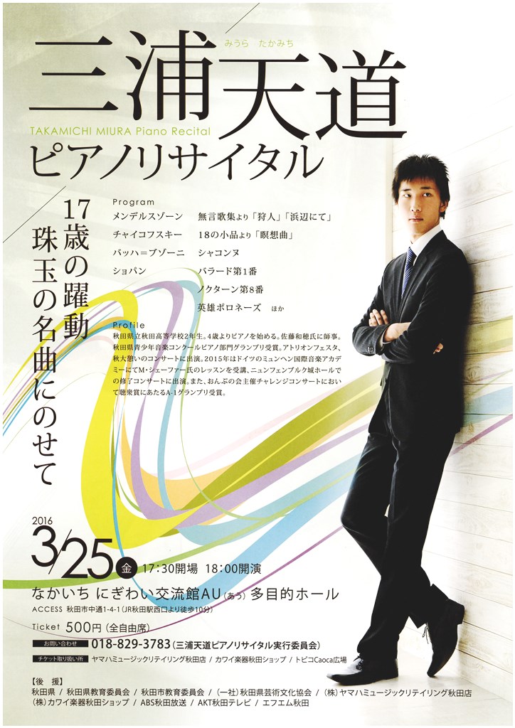 三浦天道 ピアノリサイタル 期間:2016年03月25日 開催日:平成28年3月25日(金) 時 間:17:30 開場/18:00 開演 会 場:秋田市にぎわい交流館 3F 多目的ホール チケット:¥500 (全自由席) 【チケット取扱い所】 ・ヤマハミュージックリテイリング秋田店 ・カワイ楽器秋田ショップ ・トピコCaoca広場 問合せ:018-829-3783 (三浦天道ピアノリサイタル実行委員会)