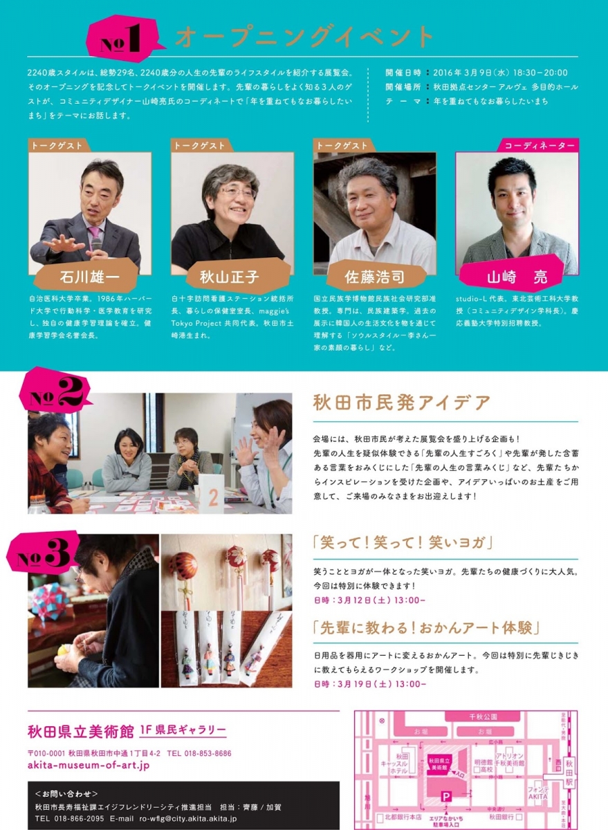 展覧会「2240歳スタイル~時間を味方にする人生の先輩たち~」 期間:2016年03月09日 ~ 2016年03月21日 会 期:3月9日(水)~3月21日(月・祝) 時 間:10:00~18:00(最終日のみ14:30まで) 会 場:秋田県立美術館 1F県民ギャラリー 入場料:無料 問合せ:秋田市長寿福祉課エイジフレンドリー推進担当 ☎018-866-2095