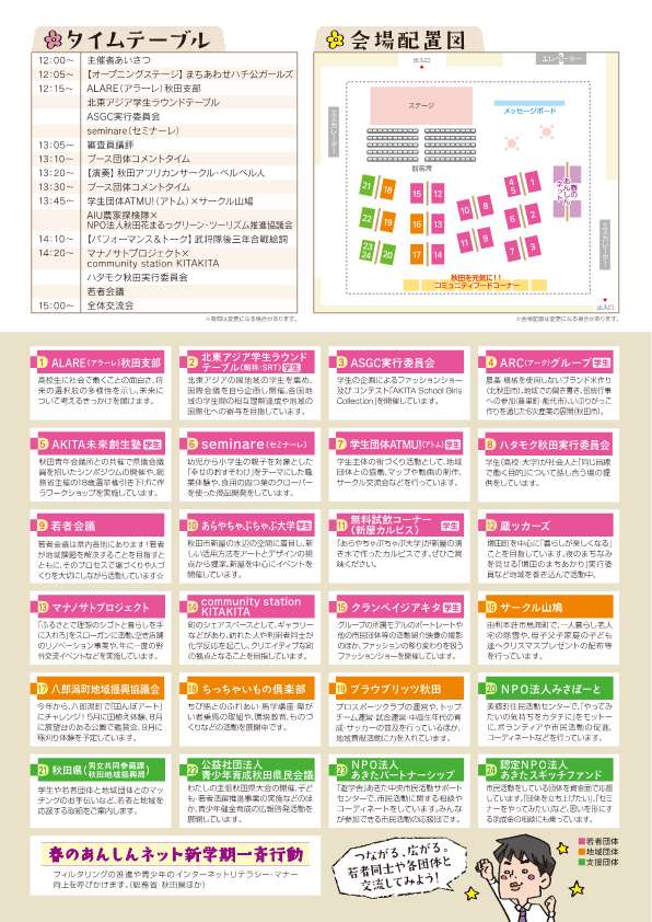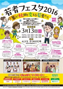 「若者フェスタ2016〜集え!秋田を変える若者たち〜」 期間:2016年03月13日 開催日:3月13日(日) 時 間:12:00~16:00 会 場:アルヴェ きらめき広場 入場料:無料 問合せ:秋田地域振興局 総務企画部 ☎︎018-860-3319