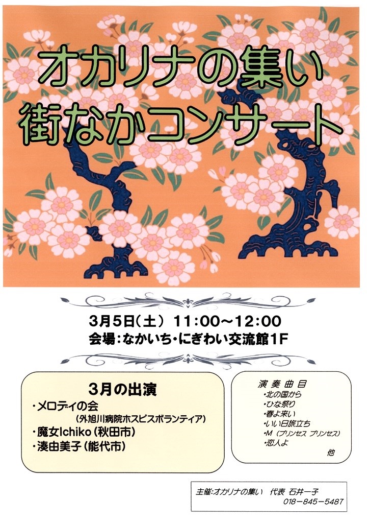 オカリナの集い 街なかコンサート 期間:2016年03月05日 開催日:3月5日(土) 時 間:11:00~12:00 会 場:秋田市にぎわい交流館 1F まち発見・発信ステーション 主 催:オカリナの集い 代表 石井一子 ☎ 018-845-5487