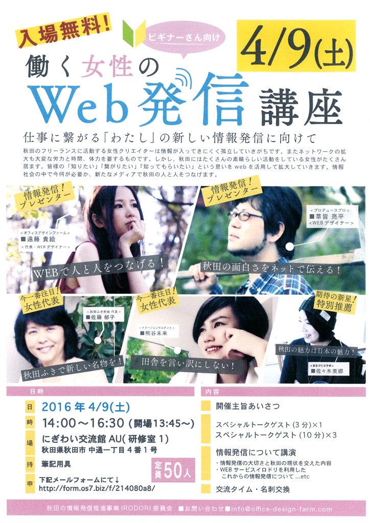 働く女性の”ビギナーさん向け”Web発信講座 期間:2016年04月09日 開催日:4月9日(土) 時 間:14:00~16:30(開場13:45~) 会 場:4F 研修室1 参 加:無料(定員50名) 持ち物:筆記用具 申 込:下記メールフォームにて http://form.os7.biz/f/214080a8/ 問合せ:秋田の情報発信推進事業IRODORI委員会 ✉info@office-design-farm.com