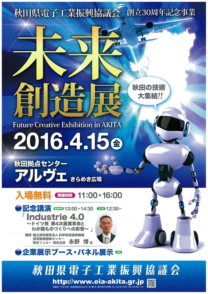 未来創造展 期間:2016年04月15日 開催日:4月15日(金) 時 間:11:00~16:00 会 場:アルヴェ きらめき広場 入場料:無料 問合せ:秋田県電子工業振興協議会 ☎︎018-867-8422