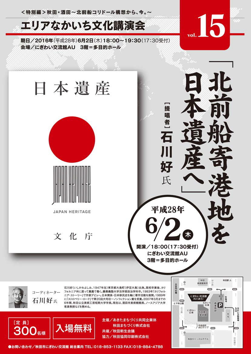 エリアなかいち文化講演会vol.15〈特別編〉 期間:2016年06月02日 〈特別編〉秋田・酒田〜北前船コリドール構想から、今。〜『北前船寄港地を日本遺産へ』提唱者 石川好 氏 開催日:2016年6月2日(木) 時 間:18:00〜19:30(受付17:00〜) 会 場:3階 多目的ホール 入場料:無料(定員300名) 問合せ:秋田市にぎわい交流館 総合案内 ☎018-853-1133