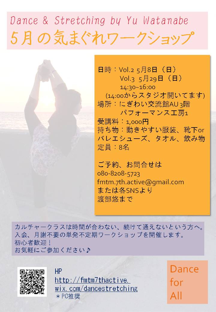 5月の気まぐれワークショップ 期間:2016年05月08日 5月スケジュール・Vol.2 5月08日(日)・Vol.3 5月29日(日) 時 間:14:30~16:00 会 場:秋田市にぎわい交流館 3F パフォーマンス工房1 受講料:¥1,000 定 員:8名 ご予約・お問い合わせ☎ 080-8208-5723/✉ fmtm.7th.active@gmail.comまたは各SNSより 渡部悠 まで