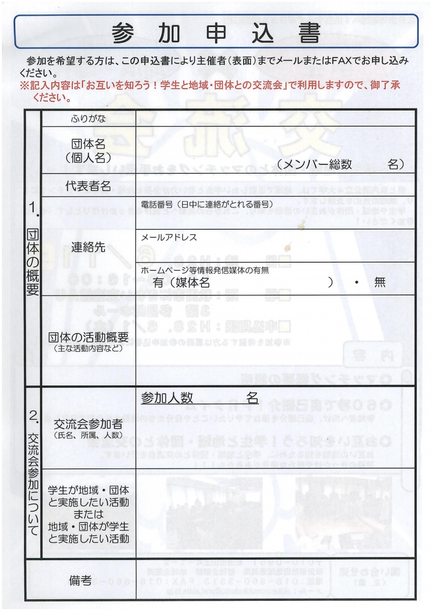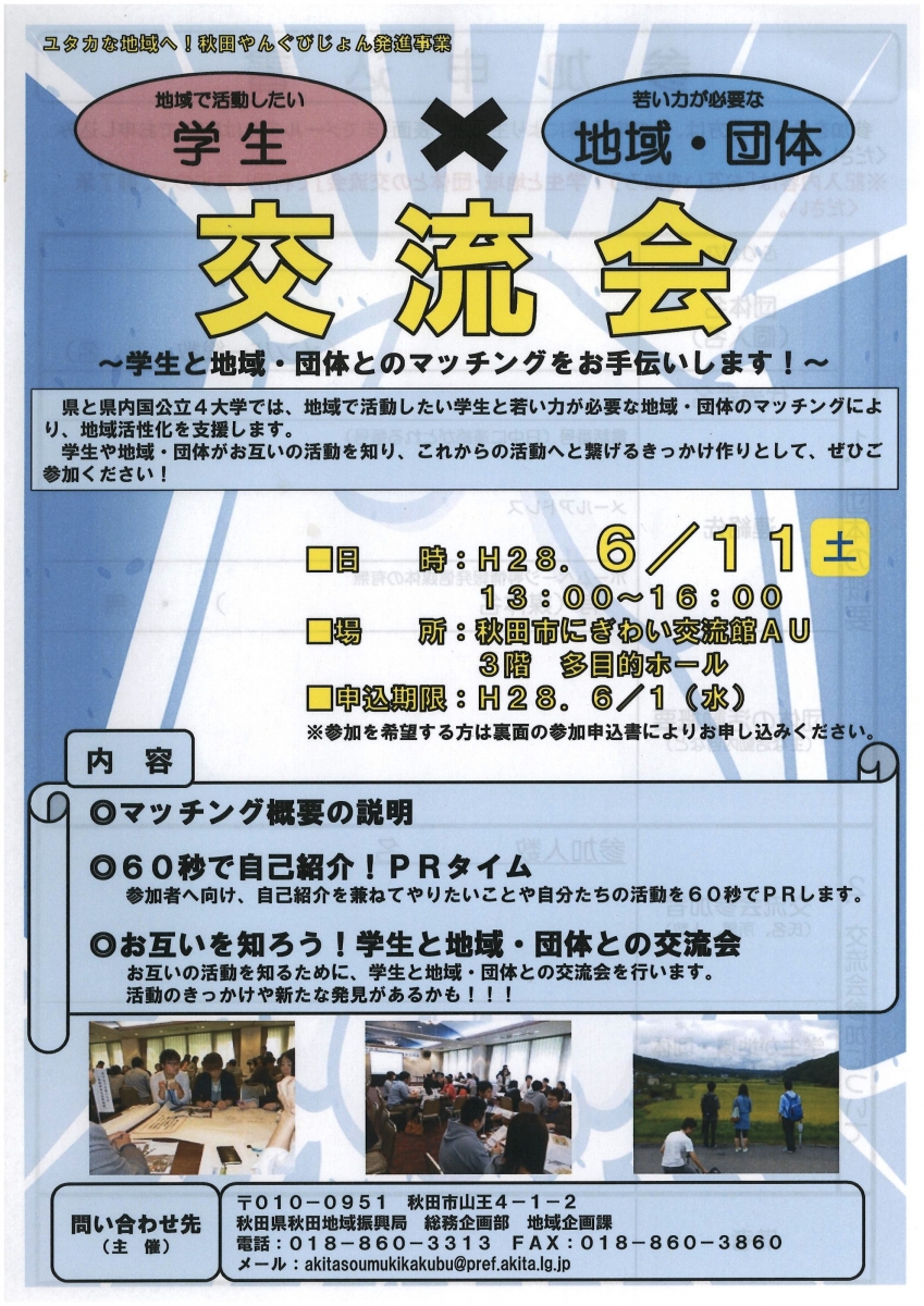 秋田やんぐびじょん 交流会 期間:2016年06月11日 日 時:6月11日(土) 時 間:13:00~16:00 会 場:秋田市にぎわい交流館 3F多目的ホール 申込み期限:6月1日(水) ※参加を希望する方は参加申し込み書によりお申込みください。 問い合わせ先:秋田県秋田地域振興局総務企画部地域企画課 ☎018-860-3313