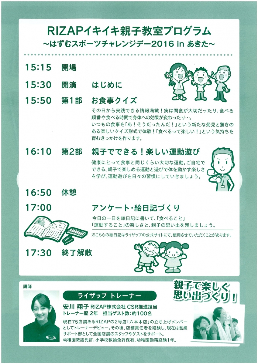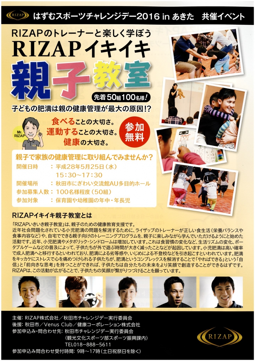 RIZAPイキイキ親子教室 期間:2016年05月25日 開催日:5月25日(水) 時 間:15:30~17:30 (15:15開場) 会 場:秋田市にぎわい交流館 3F 多目的ホール 参 加:無料 ※参加募集人数:100名様程度(50組) ※参加対象:保育園や幼稚園の年中・年長児 主 催:RIZAP株式会社/秋田市チャレンジデー実行委員会 参加申し込み・お問い合わせ先秋田市チャレンジデー実行委員会(観光文化スポーツ部スポーツ振興課内)☎ 018-888-5611※参加申込問合せ受付時間:9:00~17:00(土日祝祭日を除く)