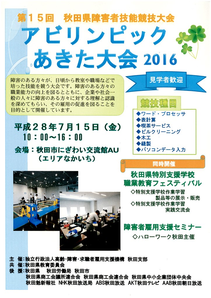 第15回秋田県障害者技能競技大会「アビリンピックあきた大会2016」 期間:2016年07月15日 開催日:7月15日(金) 時 間:10:00~16:00 会 場:秋田市にぎわい交流館 2F 展示ホール 他 主 催:独立行政法人高齢・障害・求職者雇用支援機構 秋田支部 ■同時開催 「秋田県特別支援学校 職業教育フェスティバル」