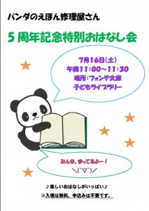 パンダのえほん修理屋さん 5周年記念特別おはなし会 期間:2016年07月16日 開催日:7月16日(土) 時 間:11:00~11:30 会 場:フォンテAKITA 6階 フォンテ文庫 入場料:無料(申込み必要ありません。直接会場へどうぞ) 問合せ:フォンテ文庫 ☎018-893-6167