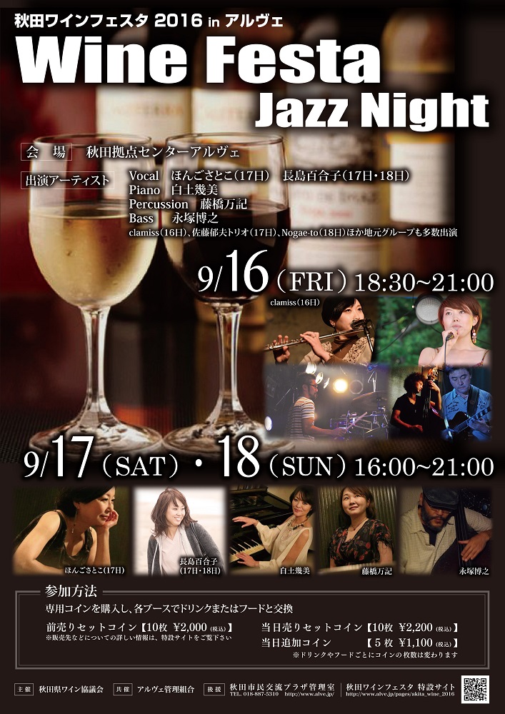 秋田ワインフェスタ2016 in アルヴェ 期間:2016年09月16日 ~ 2016年09月18日 開催日:9月16日(金)、17日(土)、18日(日) 時 間:16日 18:30~21:00 17日、18日 16:00~21:00 会 場:アルヴェ 1階きらめき広場 料 金:前売セットコイン 10枚2,000円 当日セットコイン 10枚2,200円 当日追加コイン 5枚1,100円 問合せ:秋田市民交流プラザ管理室 ☎018-887-5310